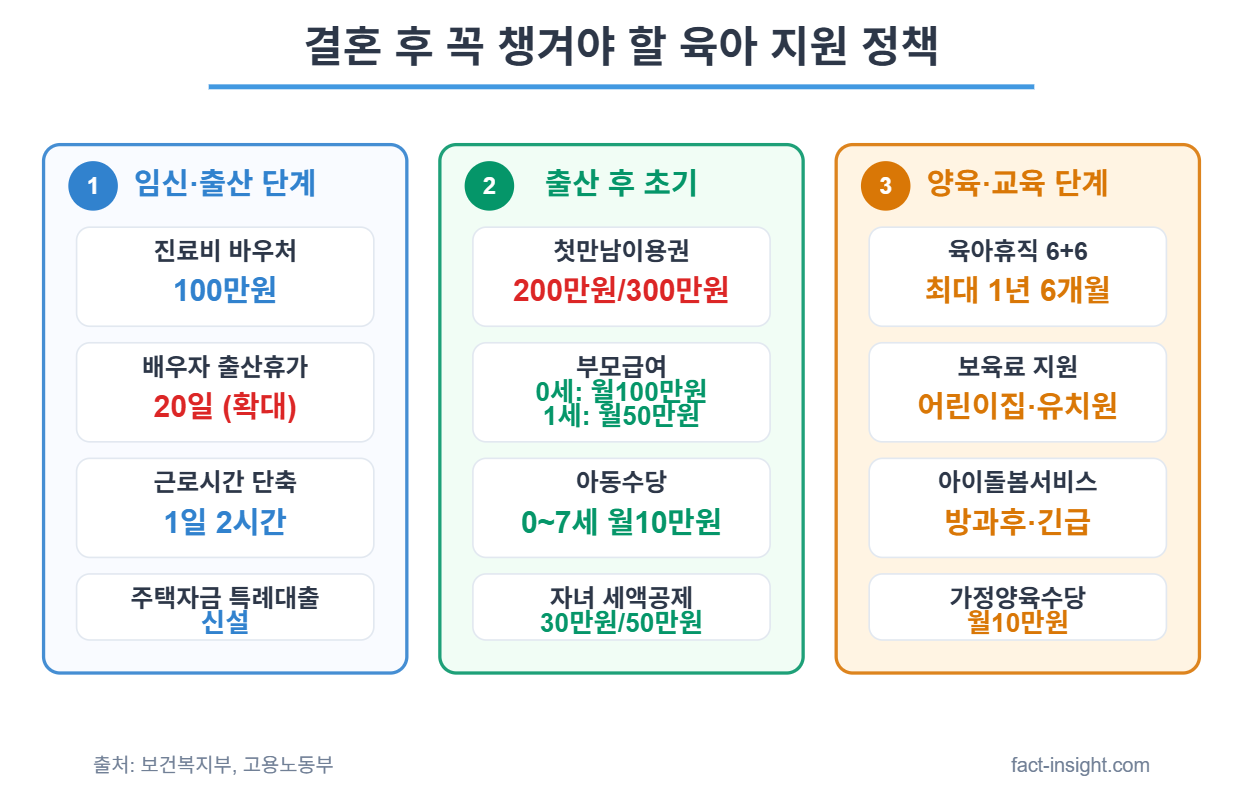 신혼부부가 결혼 후 꼭 챙겨야 할 육아 지원 정책을 시기별로 완벽 정리했습니다. 임신·출산 단계부터 양육·교육 단계까지, 단계별 맞춤 지원을 통해 최대 연간 수백만원의 혜택을 받을 수 있습니다. 2025년 개정된 최신 정책까지 반영하여 놓치기 쉬운 혜택을 모두 안내해 드립니다.