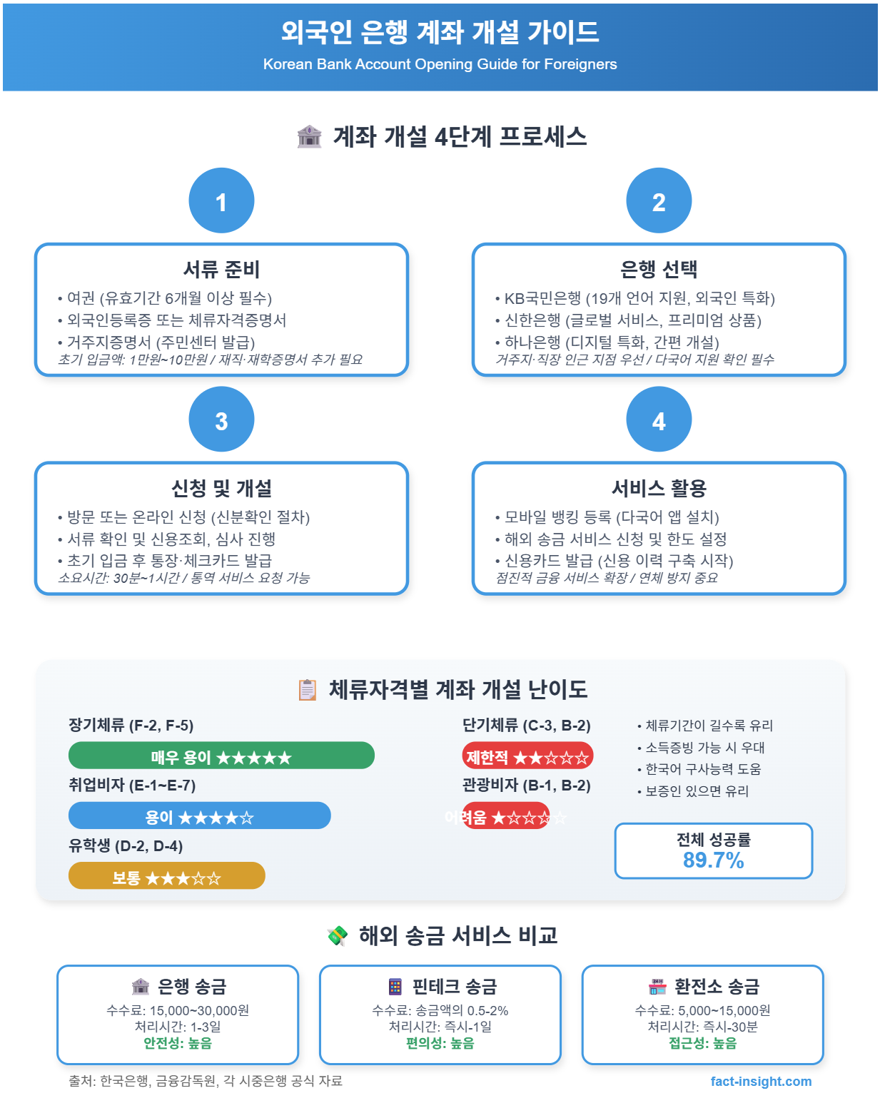 | 취업비자(E-1~E-7) | 용이 | 재직증명서 필수 | KB국민, 신한, 하나 |
