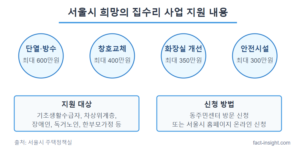 - 온라인 신청: 서울시 집수리원스톱 홈페이지 (일부 대상만 가능)