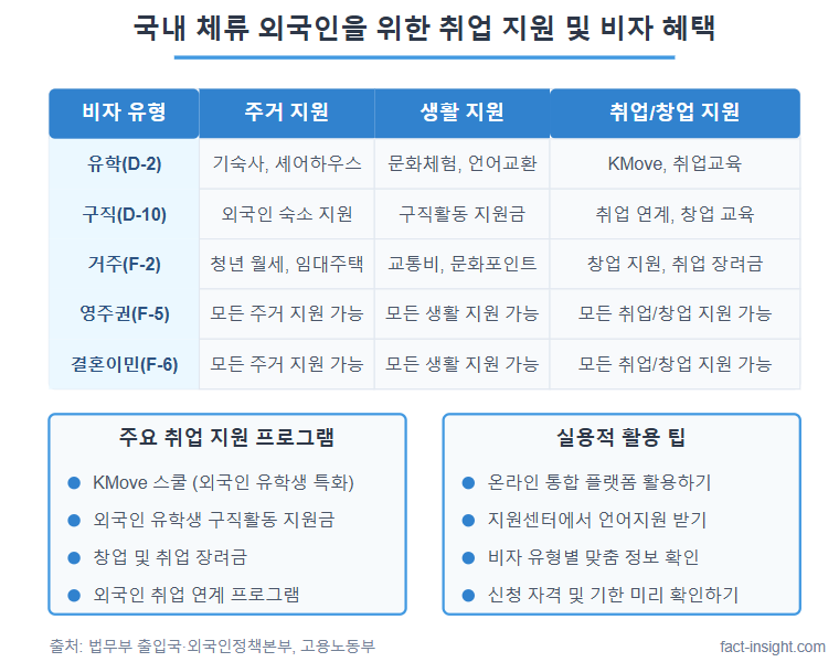 특히 주목할 만한 변화는 취업 지원 프로그램의 다양화와 비자 유형별 제한 완화입니다. 전통적으로 F-5(영주권), F-6(결혼이민) 비자 소지자에게만 제공되던 많은 혜택이 F-2(거주) 비자 소지자에게도 확대되었으며, D-2(유학) 및 D-10(구직) 비자 소지자를 위한 맞춤형 프로그램도 크게 늘어났습니다.