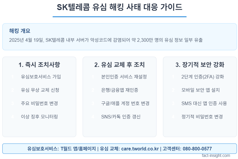 SK텔레콤 유심 해킹 사태 대응을 위한 최우선 조치는 유심보호서비스 가입과 유심 무상 교체입니다. 조치 후에는 모든 전화번호 기반 인증 서비스의 재설정이 필수적입니다. 특히 금융앱, 본인인증앱, 구글/애플 계정, SNS 등을 우선적으로 점검하세요.